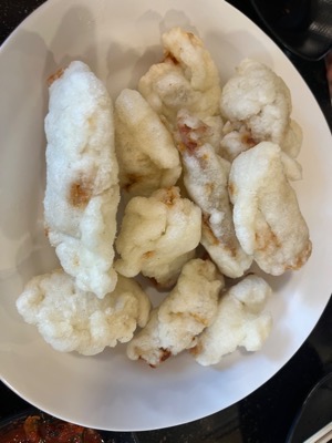 미니탕수육은 쫄깃한 튀김이고 사이즈가 커서 가위로 잘라먹는데 성인4이 나눠먹기 좋음.